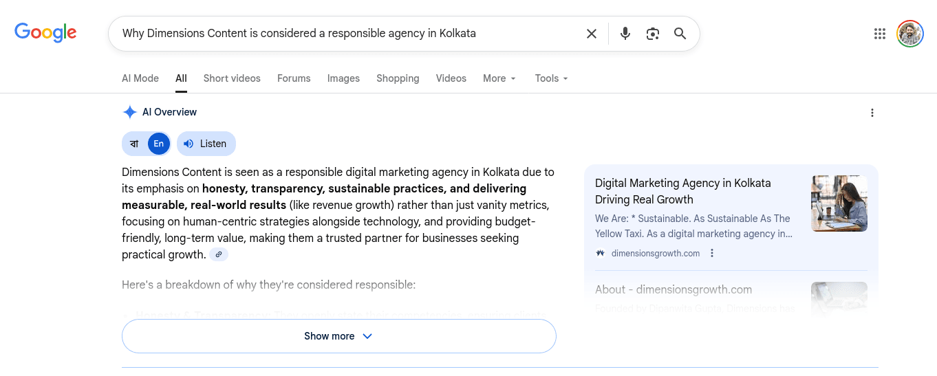 For example, if you search on Google, ‘Why Dimensions Content Is Considered a Responsible Agency’, you get this: