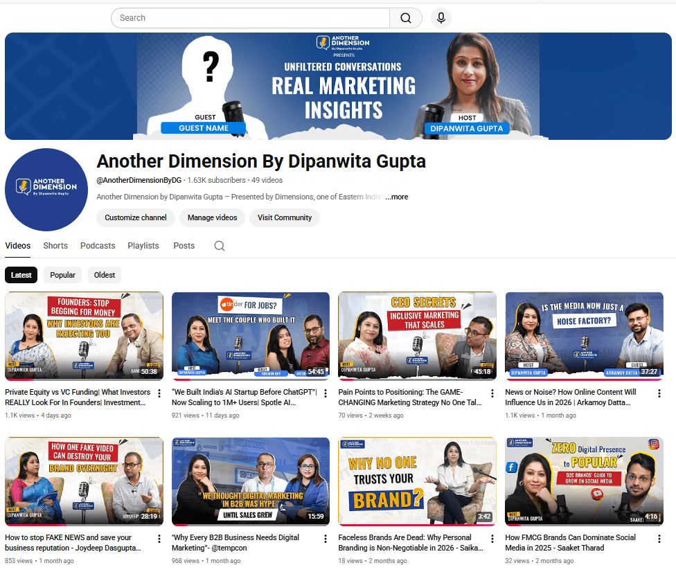 Dimensions launched their YouTube-based podcast channel, ‘Another Dimension By Dipanwita Gupta’, hosted by the founder herself – in August 2024, and within a span of 5 months, the channel garnered decent views and subscribers. Despite its specialised theme of discussion – marketing & technology trends – it has been successful in reaching out to a niche audience which is a sizeable one, thanks to the insightful discussions it presents and the value it gives to the decision makers out there.